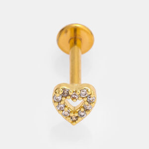 Piercing de acero quirúrgico, plano de atrás, largo estandar, con cilueta de corazón con circonias, se desenrosca adelante, ideal para labio, tragus, helix, y casi cualquier perforación.