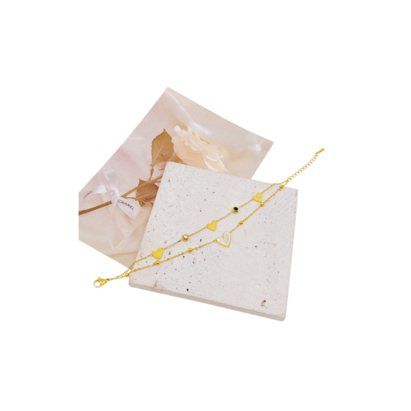 Pulsera dorada en leyers de hacero inoxidable con dijes de corazón, pieda negra, circonia y conchanácar
